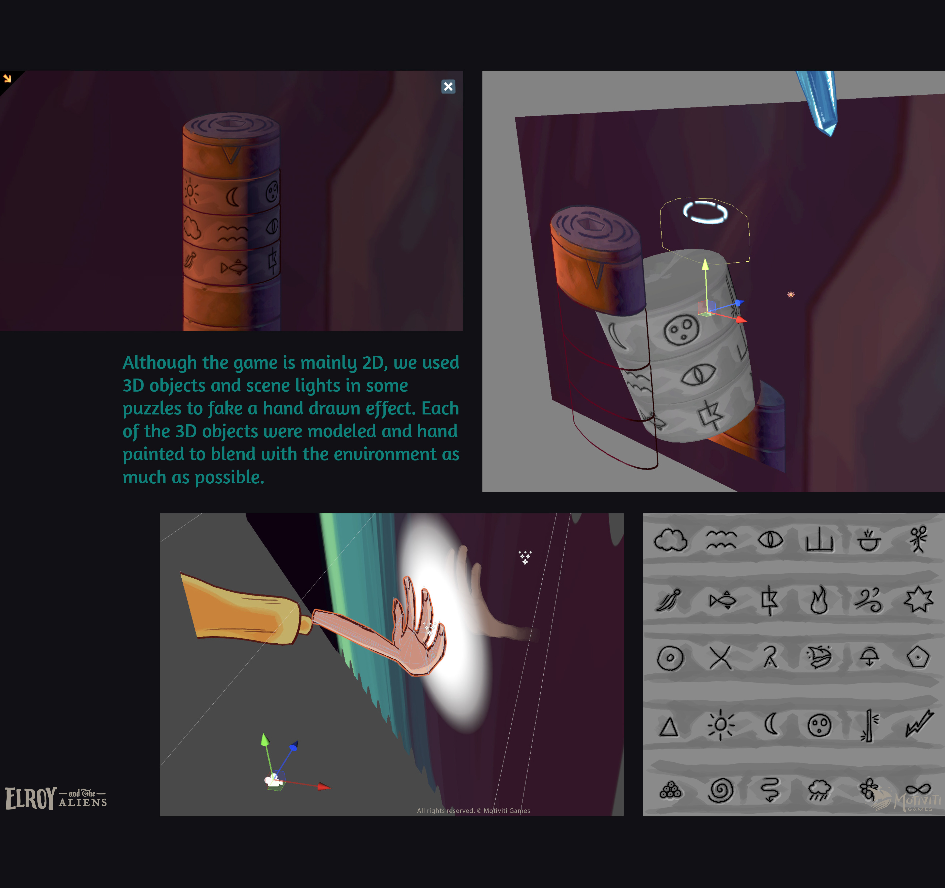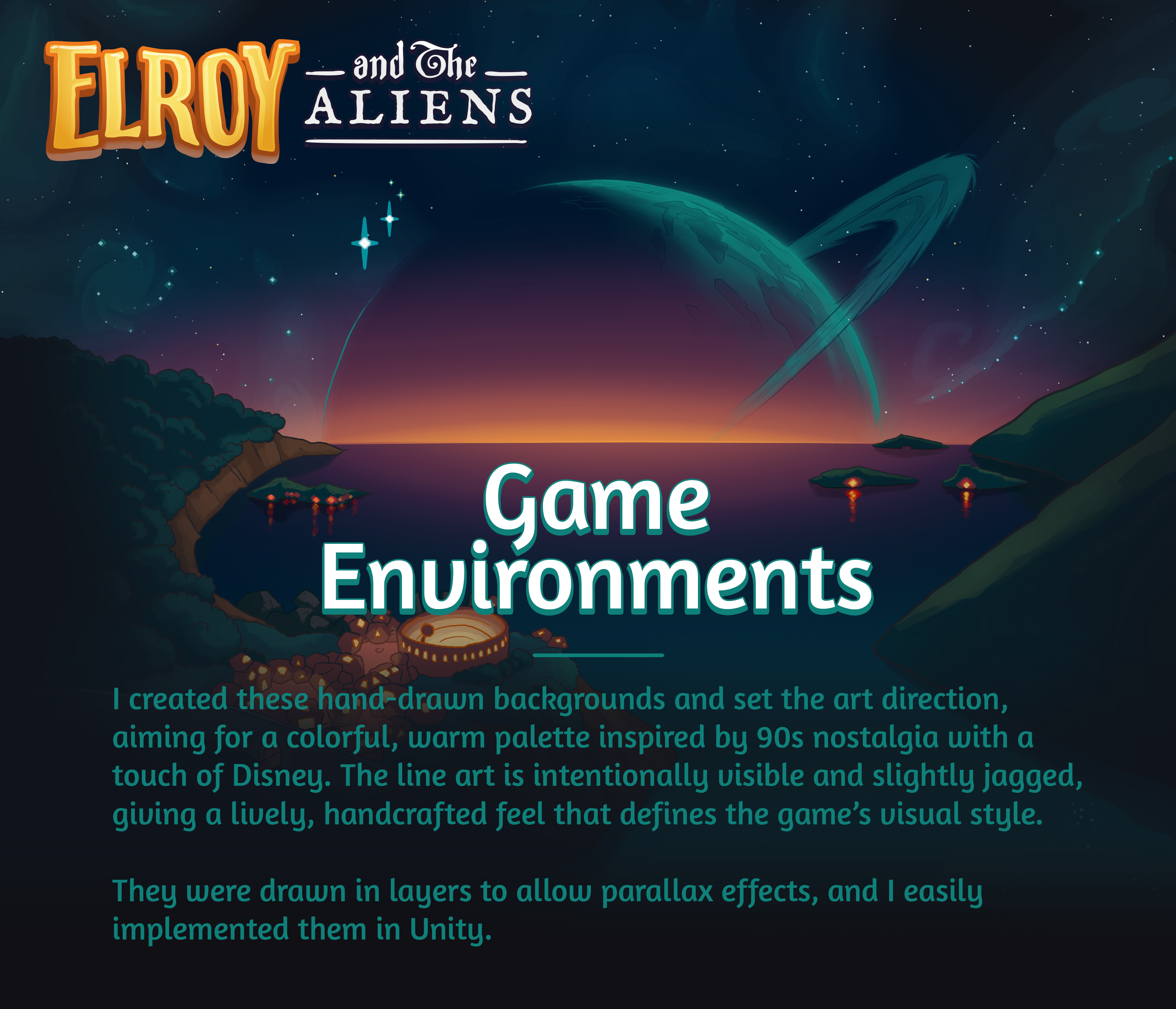 This game is our love letter to adventure games. I grew up playing the classics, and we wanted to capture the spirit of the ’90s. My role in this project was broad—from the initial concepts to the finished art for the characters and environments, as well as storyboarding and animating most of what you see in the game. We assembled the game in Unity, where I also implemented all the assets, handled rigging, and created animations. The game features over 80 custom cutscenes, some showcasing rich frame-by-frame animation and others using puppet animation that mimics hand-drawn movement. I documented the entire art process in this artbook, which we also published.Grab it here: https://store.steampowered.com/app/3786870/Elroy_and_the_Aliens_Artbook/.